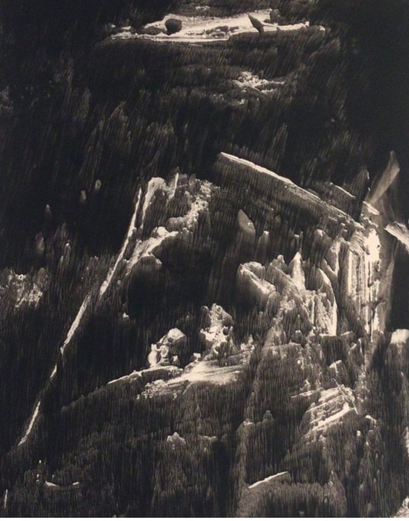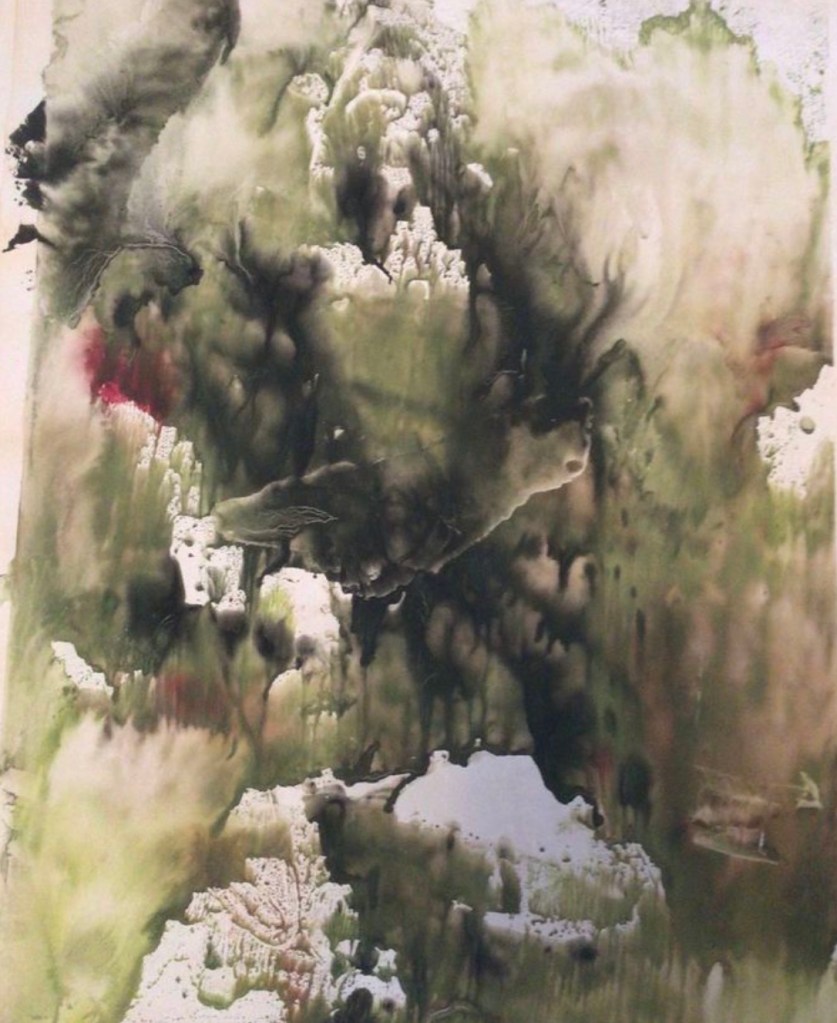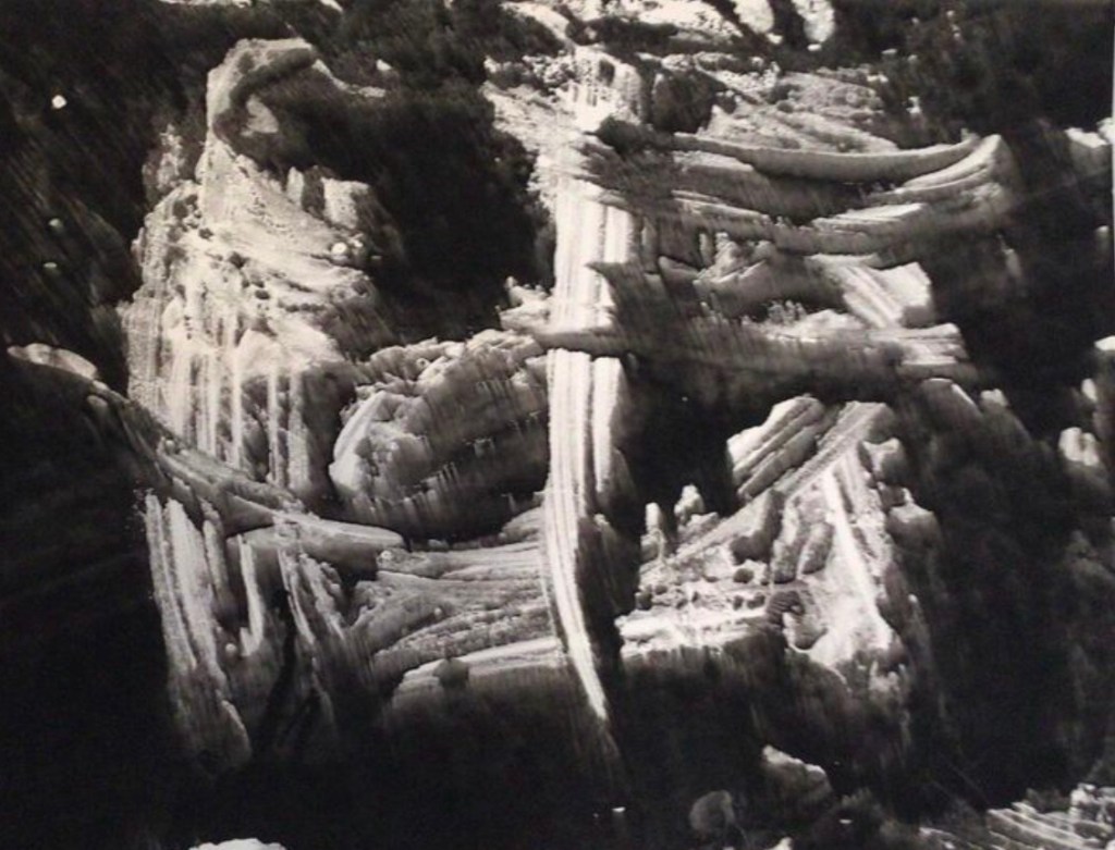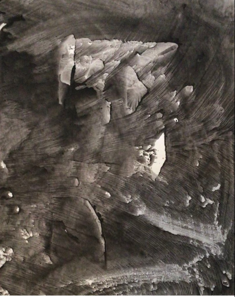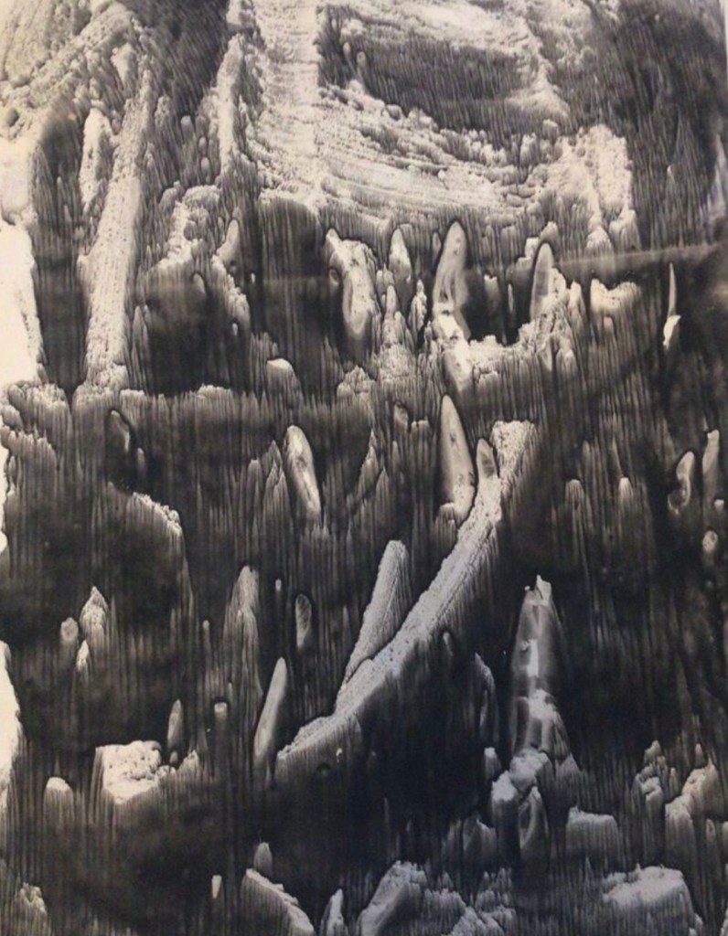 During the following year, Achilles, an avid experimenter, started using his “etching press” in the creation of monoprints, unique, one of a kind images. He was not only experimenting with metal plates and different types of inks, but glass plates, as well! His Quarry Series pulled from glass plates (in vitro), depict what seems to be barren, eerie, rocklike formations, suspended in space. These prints may possibly be some of the earliest examples of the monoprint in abstract expressionism. These prints are from 1959, on paper (3’X4′), using various sumi inks (Achilles was especially fond of Kaimei):