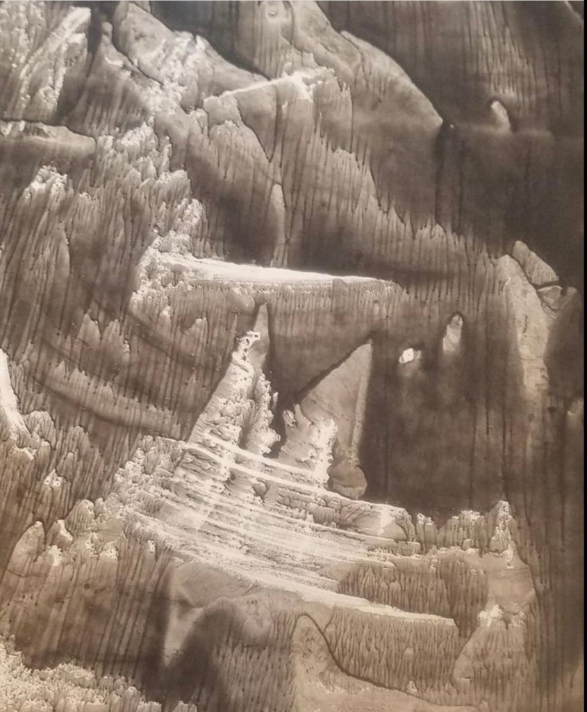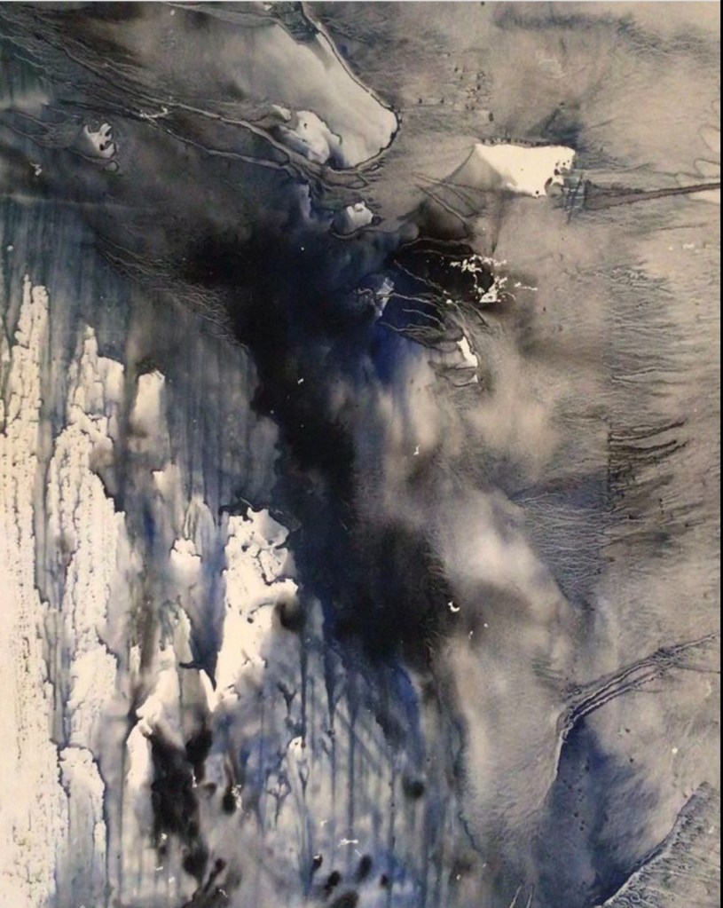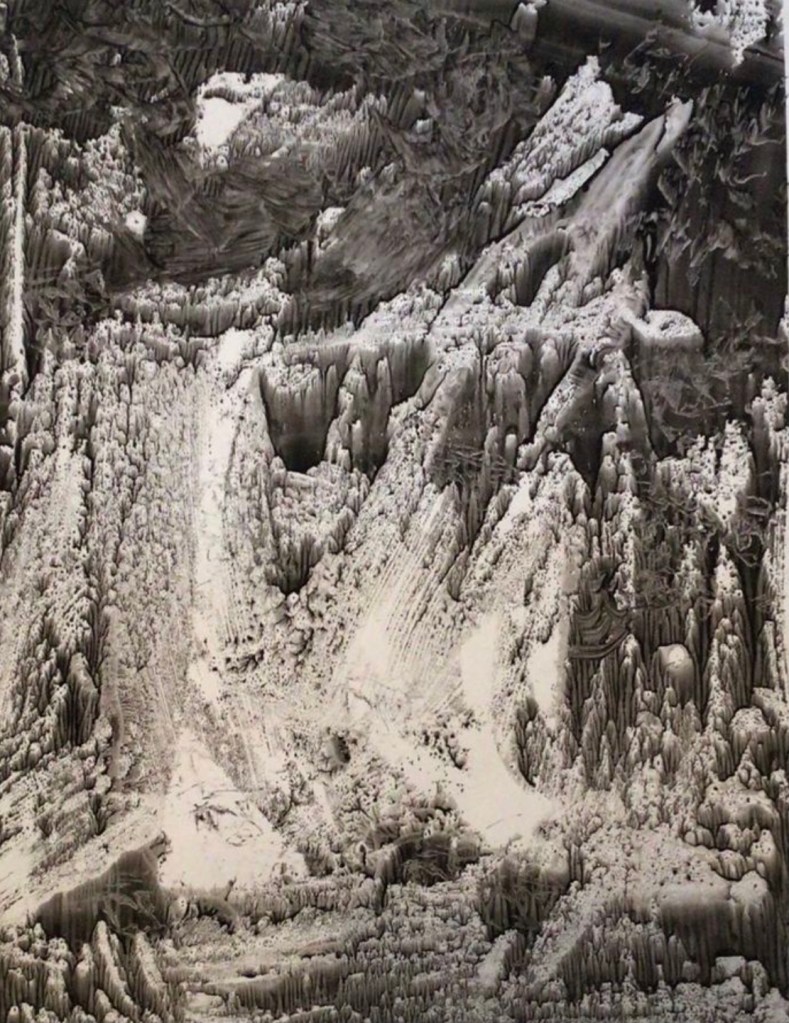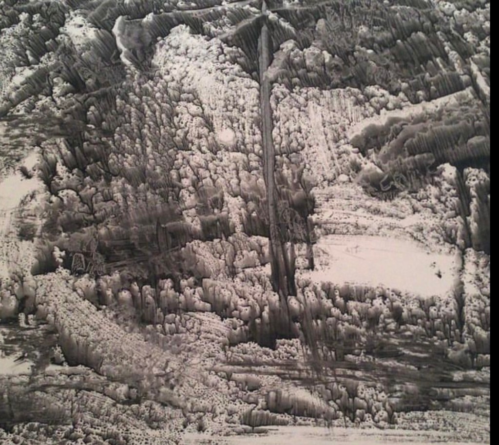 During the following year, Achilles, an avid experimenter, started using his “etching press” in the creation of monoprints, unique, one of a kind images. He was not only experimenting with metal plates and different types of inks, but glass plates, as well! His Quarry Series pulled from glass plates (in vitro), depict what seems to be barren, eerie, rocklike formations, suspended in space. These prints may possibly be some of the earliest examples of the monoprint in abstract expressionism. These prints are from 1959, on paper (3’X4′), using various sumi inks (Achilles was especially fond of Kaimei):